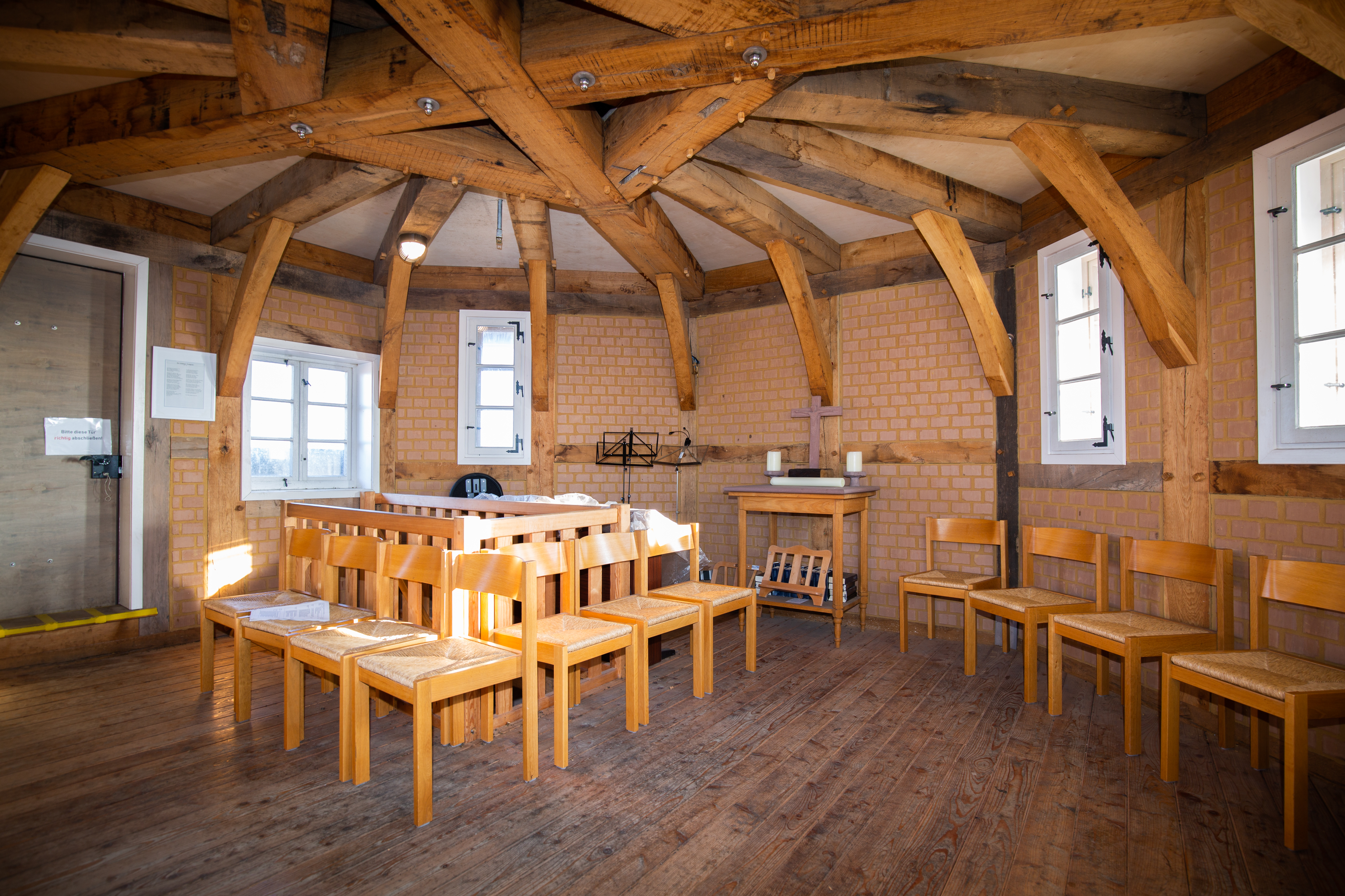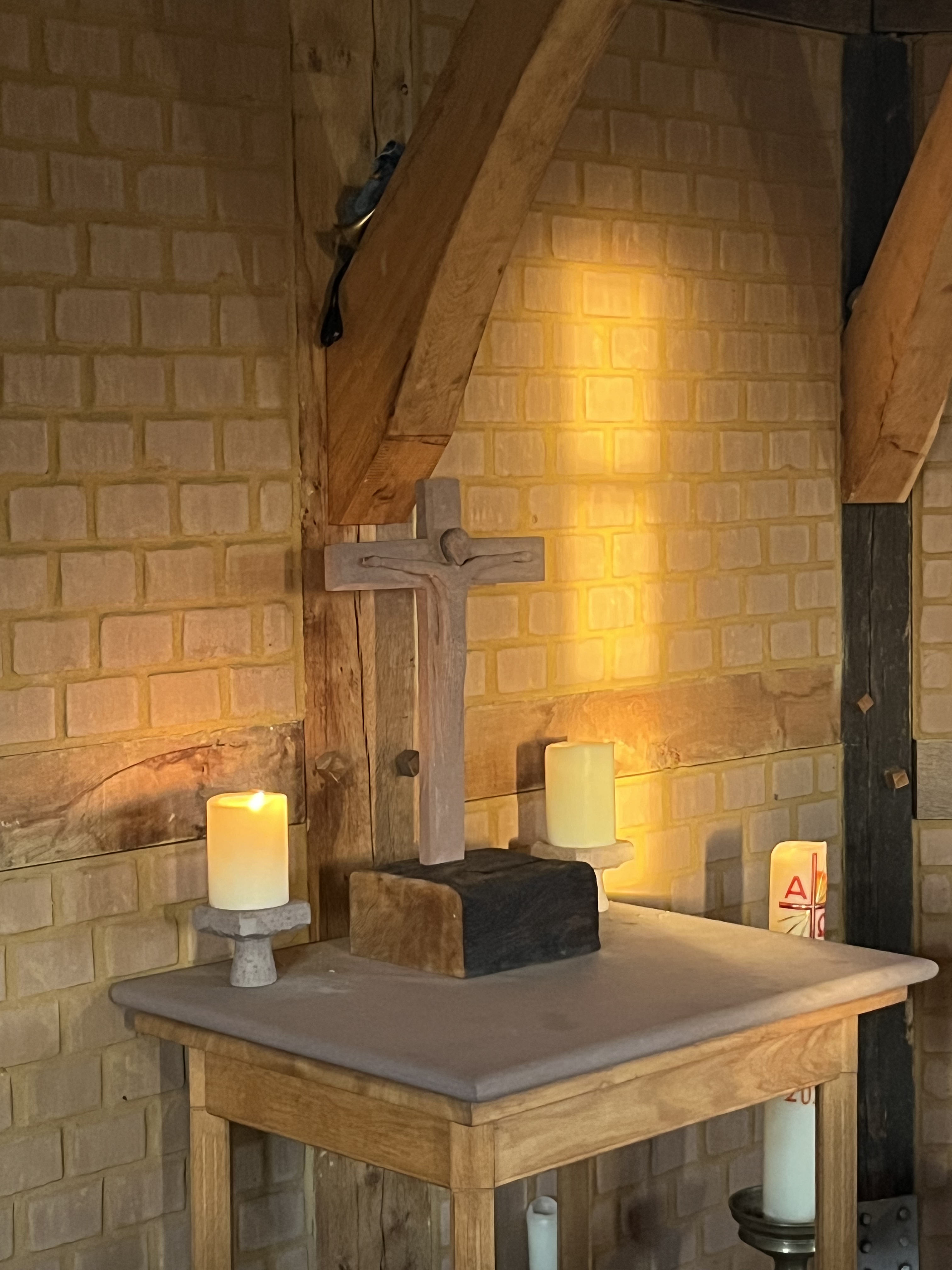 Nun haben wir eine kleine Kapelle aus Lehmziegeln im Turm, die für Andachten genutzt wird. Der Altartisch ist aus dem roten Wesersandstein neu hergestellt. Steinmetze und Zimmerleute, die nach der Brandstiftung hier weiterarbeiteten, haben die Gegenstände auf dem Altartisch gestiftet. Sie haben aus den noch brauchbaren Resten Kreuz und Kerzenleuchter aus dem vorherigen Sandstein und den Sockel des Kreuzes aus dem alten 800jährigen Eichenholz gearbeitet.